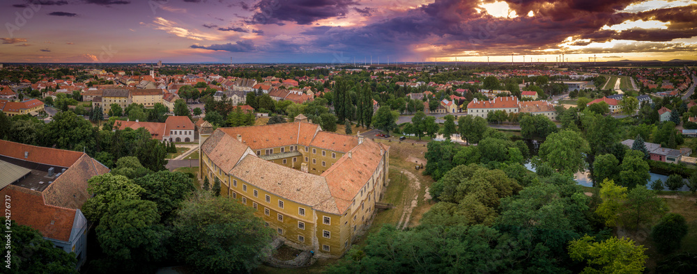 Stunning sunset with purple red blue orange and yellow colors over Mosonmagyarovar roman catholic church and castle in Hungary