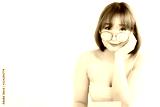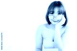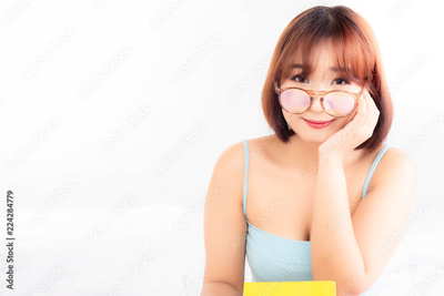 Charming beautiful young student woman wears eyeglasses and sits on a bed at bedroom. Attractive beautiful woman love studying. Cute girl feel happy with smile isolated on white background copy space
