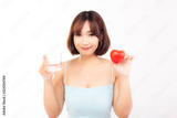 Charming beautiful young woman showing heart and fresh water. Attractive beautiful girl drink pure water everyday that make her look young and get good health with smile. isolated on white background