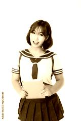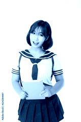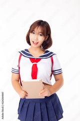 Attractive beautiful student woman hold tablet for studying subjects or doing homework on internet online and sending work to a teacher. It’s convenient to learn subjects everywhere. isolated on white
