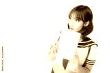 Charming beautiful student woman look copy space. Attractive beautiful woman hold tablet and wear student uniform. Pretty girl act like a satisfy, like or love something. isolated on white background