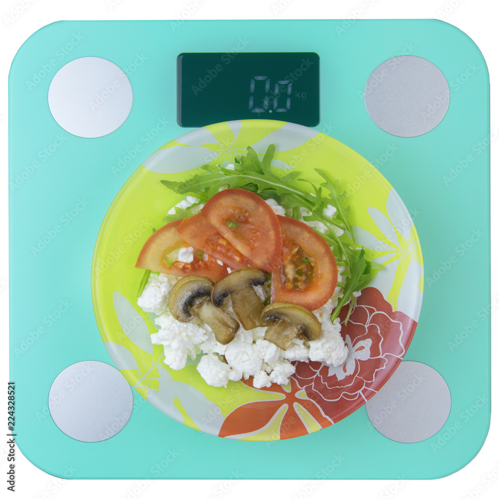 Blue electronic scales with a plate with vegetables, herbs and cottage cheese on a white isolated background.Top view.Fitness concept.