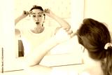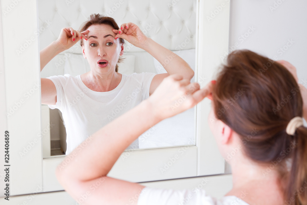 Middle age woman looking in mirror on face wrinkle forehead in bedroom. Wrinkles and anti aging skin care concept. Selective focus