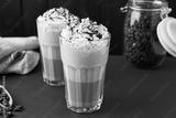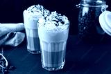 Iced caramel latte coffee in a tall glass with chocolate syrup and whipped cream. Dark background with copy space.