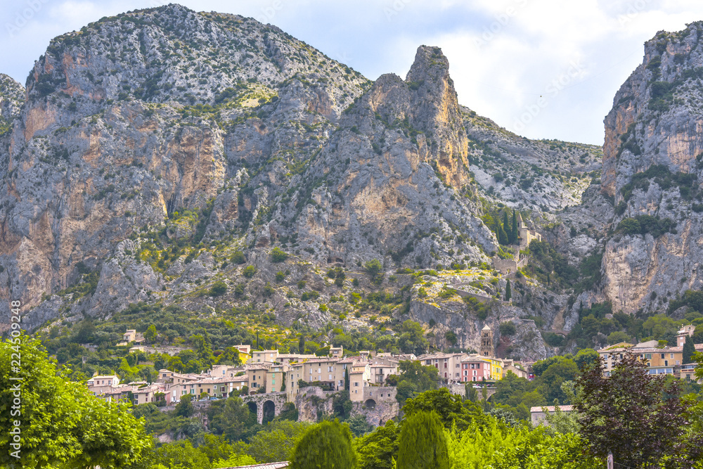panorama of village Moustiers-Sainte-Marie, Provence, pustside with surrounding mountains and peaks France, member of most beautiful villages of France, department Alpes-de-Haute-Provence