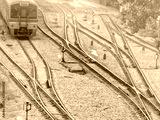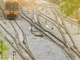 Train track and traffic sign between railway. Journey by train in the morning with warm sunrise light. Local transportation. Travel on summer by train. Junction of railroad track. Nostalgia concept.