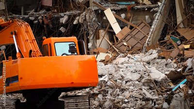 Destroyed building industrial. Building demolition by explosion. Abandoned concrete building with rubble and scrap. Earthquake ruin. Damaged or collapsed building from hurricane disaster. Backhoe.