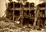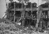 Destroyed building industrial. Building demolition by explosion. Abandoned concrete building with rubble and scrap. Earthquake ruin. Damaged or collapsed building from hurricane disaster.