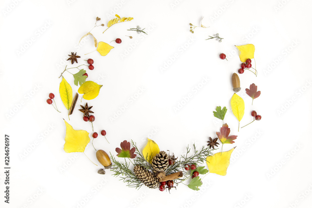 .Wreath from autumn leaves, cones, anise on white background. Autumn concept.Flat lay, copy space, mockup