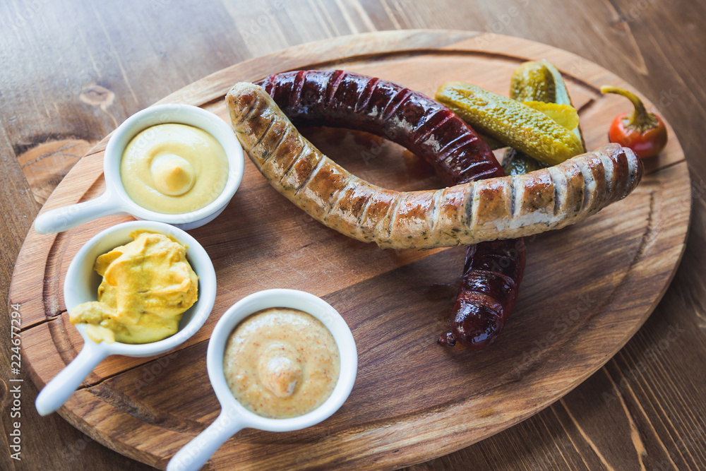Czech cuisine. Sausages, cucumber, pepper and horseradish with a restaurant. Selective focus.