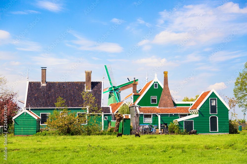 Dutch typical landscape. Traditional old dutch windmill with old houses against blue cloudy sky in the Zaanse Schans village, Netherlands. Famous tourism place. Sheep grazing on green grass.