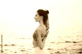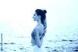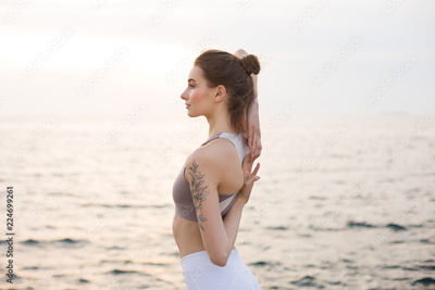Beautiful girl in sporty top and white leggings holding hands behind back with sea view on background. Young woman dreamily looking aside while practicing yoga by the sea