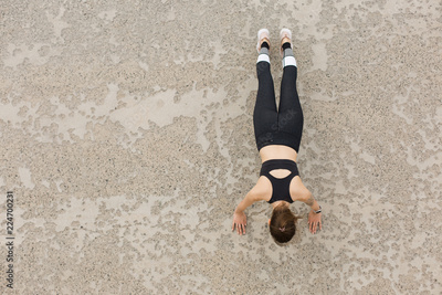 Young woman in sporty top and leggings doing sport exercises outdoor