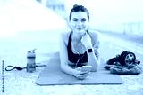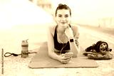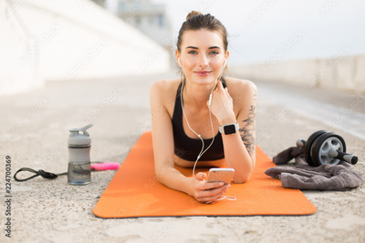 Young beautiful smiling woman in sporty top and leggings with earphones holding cellphone in hand lying on orange yoga mat with sport bottle and jump rope near while dreamily looking in camera outdoor