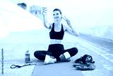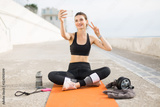 Young joyful woman in sporty top and leggings sitting in lotus pose on orange yoga mat happily taking photos on cellphone while showing two fingers gesture outdoor