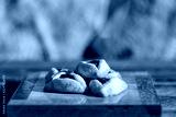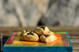 Spring picnic on the grass with homemade cookies on wooden board. Hamantaschen cookies or hamans ears for Purim celebration.Hamantaschen are sweet triangular pastries with a filling eaten on Purim.
