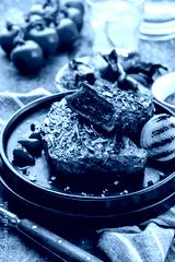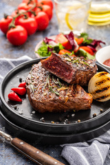 Steak - grilled beef steak. Fillet steak beef meat with fresh salad, cherry tomatoes and red pepper