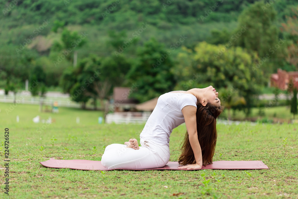 Beautiful Attractive Asian woman practice yoga mudrasana pose lying on yoga mat with green grass for yoga Meditation feeling so relax and comfortable,Healthcare Concept