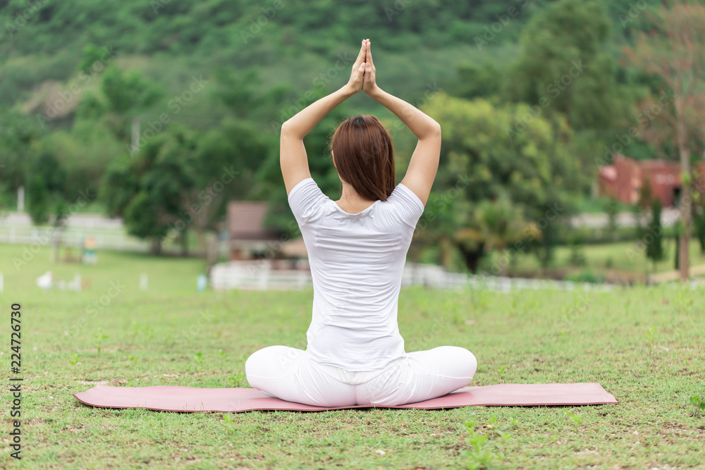 Back of view Asian woman sitting on yoga mat practice lotus pose with yoga meditation relax and refresh health on green grass feeling happiness and comfortable in garden,Healthcare concept