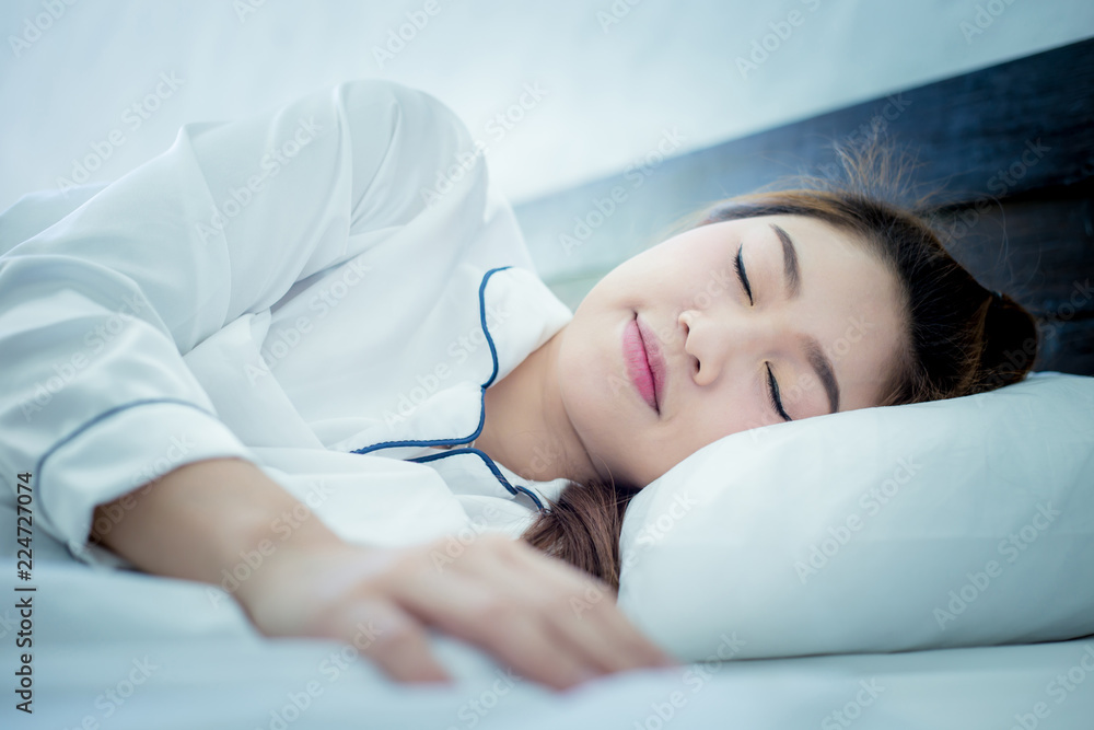 Beautiful Attractive Asian woman smile after sleep and sweet dream on bed in bedroom wake up in the morning,Healthcare Concept