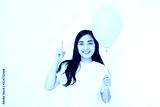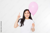 Blank template t shirt. Happy birthday. Happy asian girl with balloon isolated on white background. Copy space. Mock up.