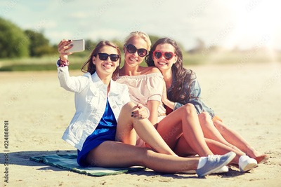summer vacation, holidays, travel, technology and people concept- group of smiling young women taking selfie with smartphone on beach