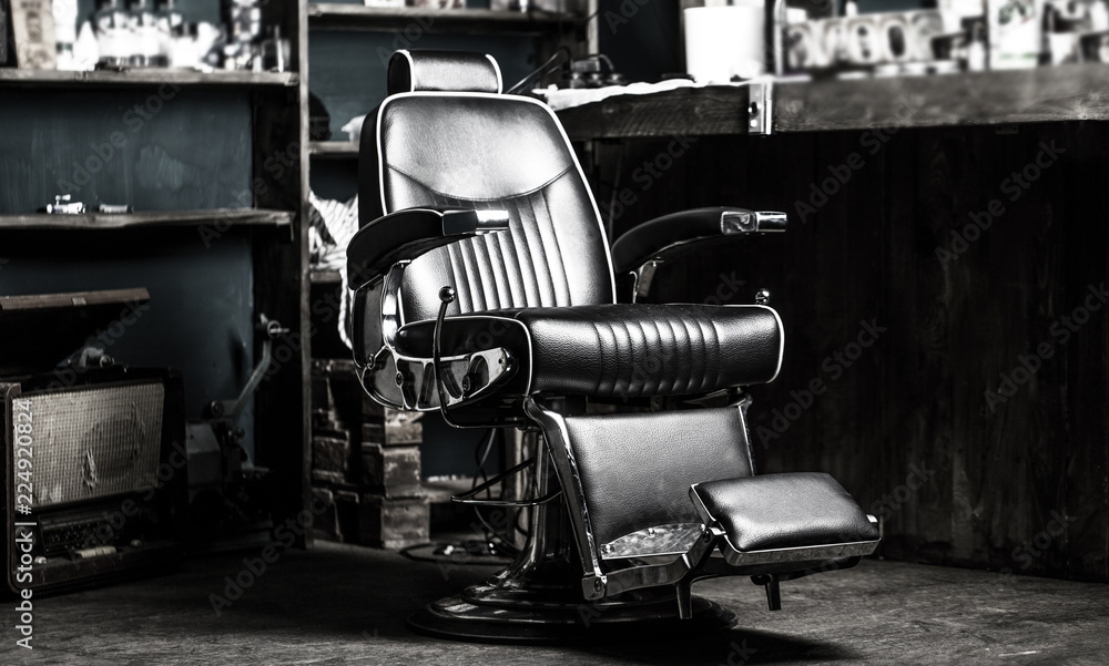 Barber shop chair. Stylish vintage barber chair. Barbershop armchair, modern hairdresser and hair salon, barber shop for men. Barbershop theme. Hairstylist in barber shop interior. Black and white.