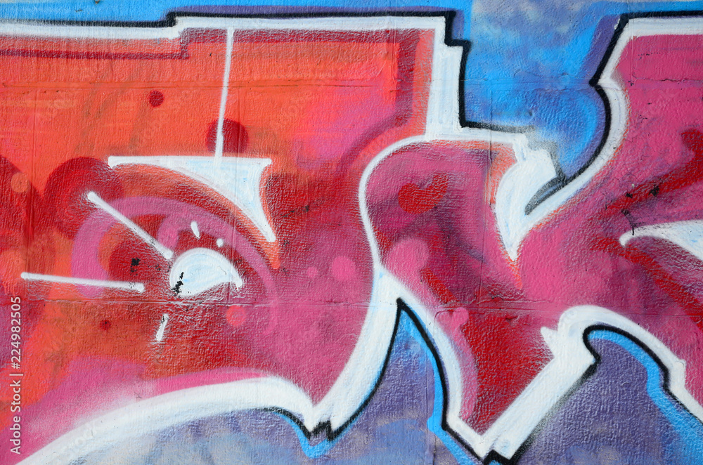 Fragment of graffiti drawings. The old wall decorated with paint stains in the style of street art culture. Colored background texture in warm tones