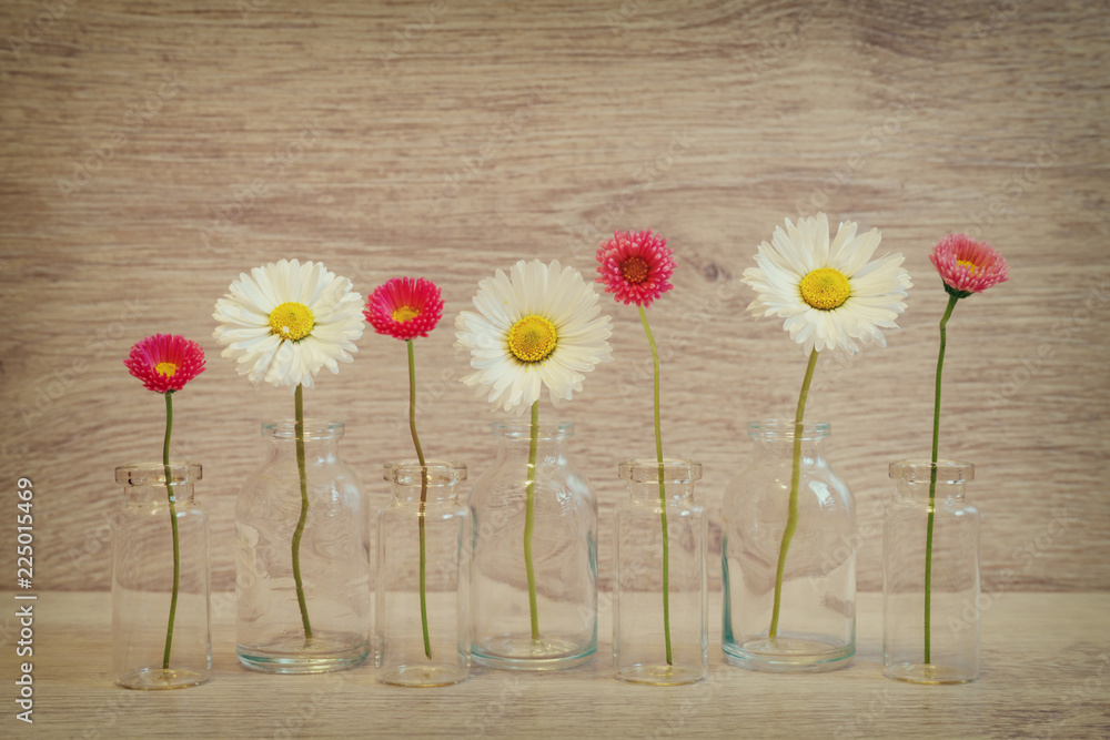 Summer creative still life in minimal style. White and pink Marguerite daisy flowers in small glass bottles on light grey background