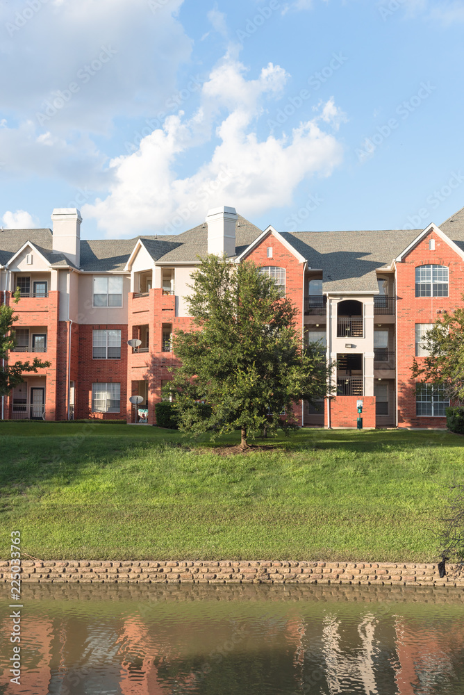 Typical multistory riverside apartment building complex surrounded by mature trees in Irving, Texas, USA.