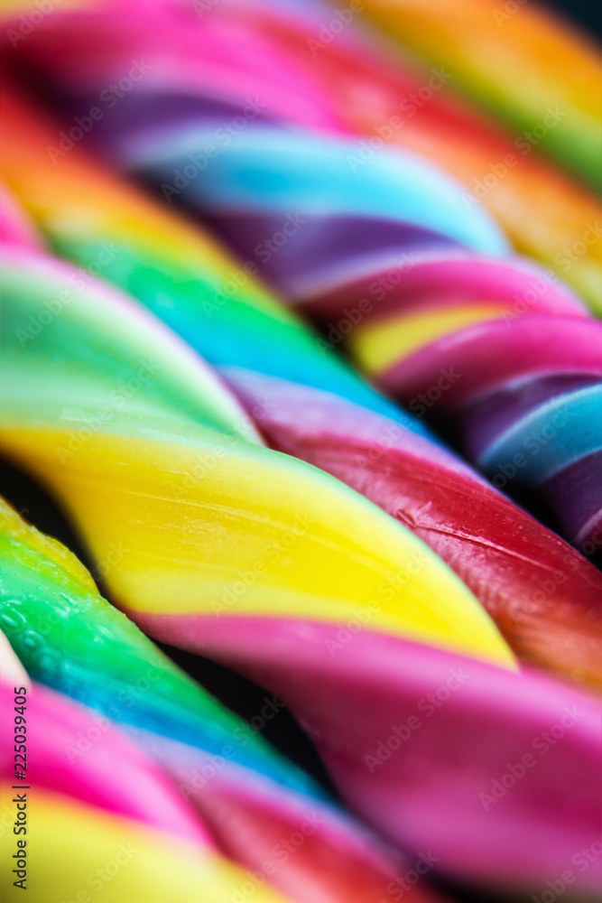 candy canes of different colors of the rainbow. Soft focus, shallow depth of field