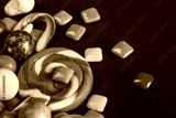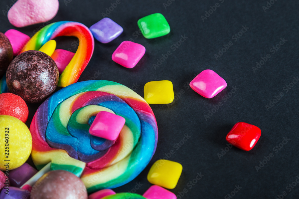different sweets on a black background, candy, chewing gum, candy, marshmallows, etc