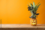Halloween holiday concept with jack o lantern pineapple on wooden table