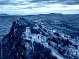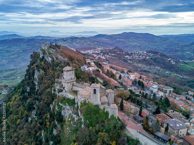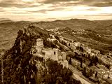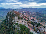 San Marino aerial city scape with castles, walls, towers, houses and red rooftops
