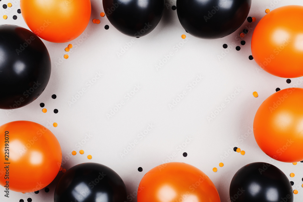 Black and orange balloons and confetti frame for Halloween card or invitation. Flat lay.