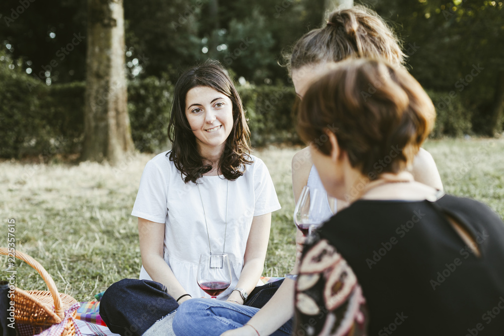 Mother and two daughters make picnic in a park at sunset during summer