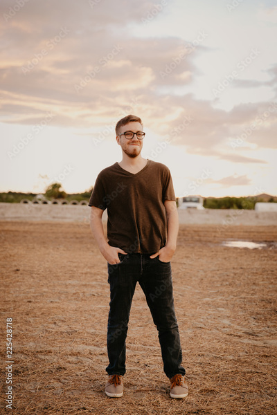 Handsome Young Male Model in Glasses and V-neck Modeling in Open Field Background