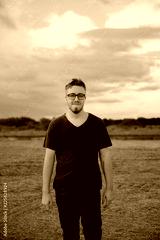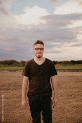 Handsome Young Male Model in Glasses and V-neck Modeling in Open Field Background