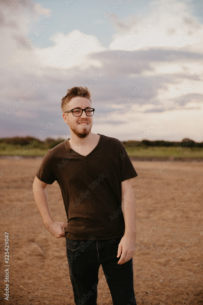 Handsome Young Male Model in Glasses and V-neck Modeling in Open Field Background