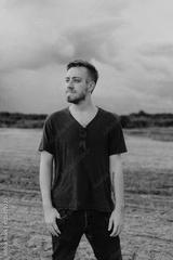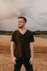 Handsome Young Male Model in Glasses and V-neck Modeling in Open Field Background