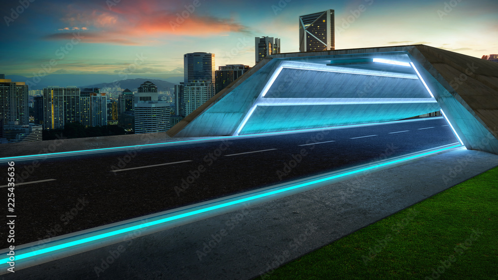 Futuristic style highway tunnel road with blue neon light and cityscape background .