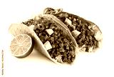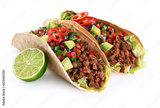 Mexican tacos with beef, tomatoes, avocado, chilli and onions isolated on white background.