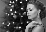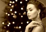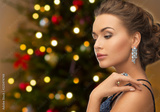 people, luxury, jewelry and fashion concept - close up of beautiful woman in black wearing diamond earring and ring over christmas tree lights background