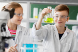 education, science and children concept - kids with test tubes studying chemistry at school laboratory