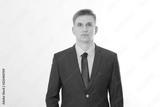 Serious businessman in blue suit and red tie isolated on white background. Business concept. Copy space and mock up