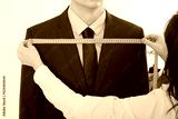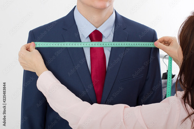 Closeup image of tailor taking measurements for business jacket suit. Businessman in red tie and blue suit at studio isolated on white background.
