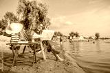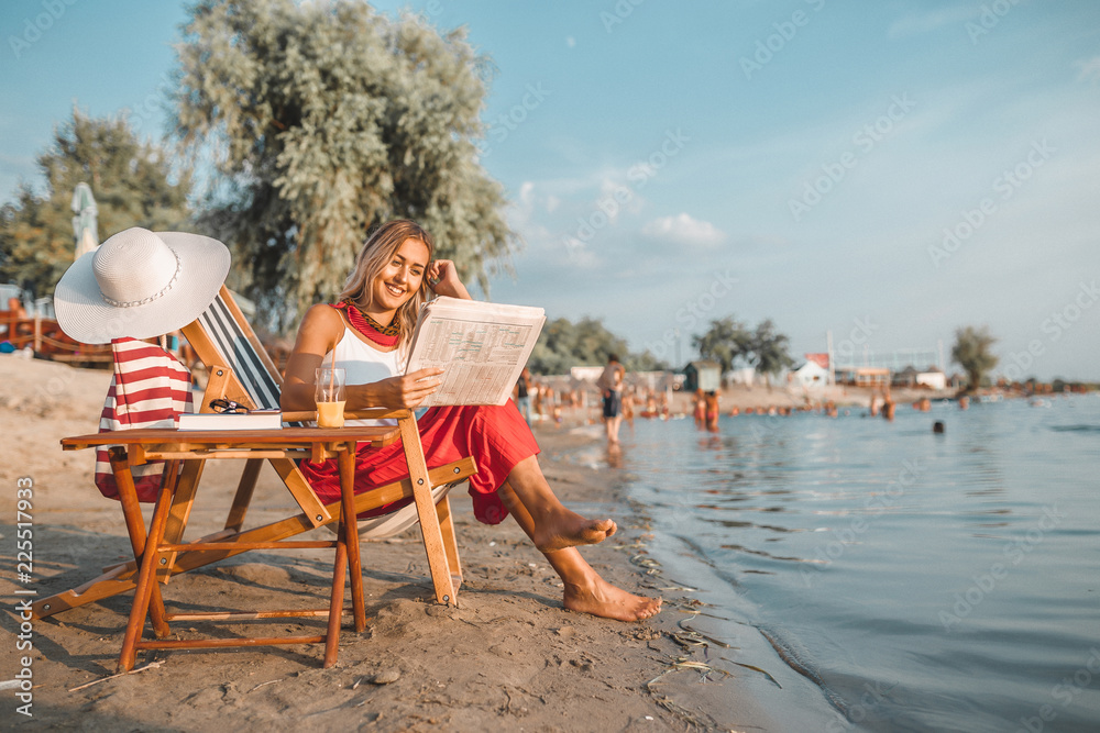 Beautiful woman reading newspaper on the beach