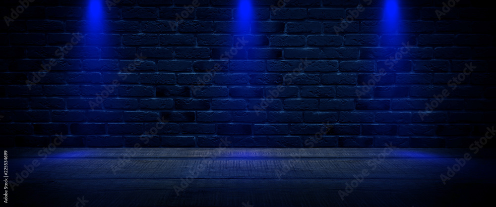 Background of an empty dark-black room. Empty brick walls, lights, smoke, glow, rays