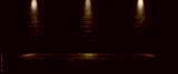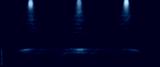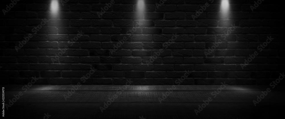 Background of an empty dark-black room. Empty brick walls, lights, smoke, glow, rays