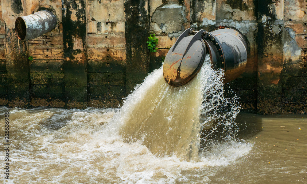 The large drain of the city is draining the wastewater into the canal, flowing into the sea, as a result of environmental issues in environment and ecology concept.